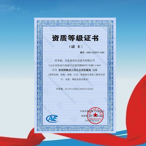 公司獲得中國(guó)音像協(xié)會(huì)音視頻工程專業(yè)委員會(huì)頒發(fā)的《音視頻集成工程企業(yè)資質(zhì)貳級(jí)》證書(shū),成為省內(nèi)首批通過(guò)該權(quán)威機(jī)構(gòu)認(rèn)證的二級(jí)資質(zhì)企業(yè)。